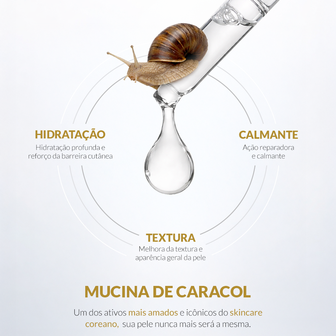 - Snail Mucus (Snail Secretion Filtrate) – ingrediente estrela que promove regeneração, hidratação intensa, ação antioxidante e melhora geral da saúde da pele.