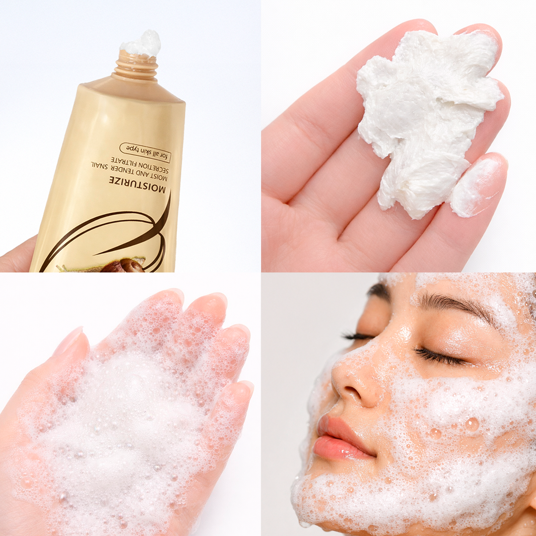 A secreção de caracol é rica em alantoína, colágeno, elastina, ácido glicólico e proteínas naturais que auxiliam na regeneração celular, hidratação e melhora da elasticidade da pele. Ao mesmo tempo, sua espuma densa e cremosa oferece uma sensação refrescante e confortável, ideal para o uso diário.